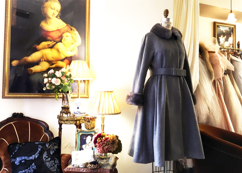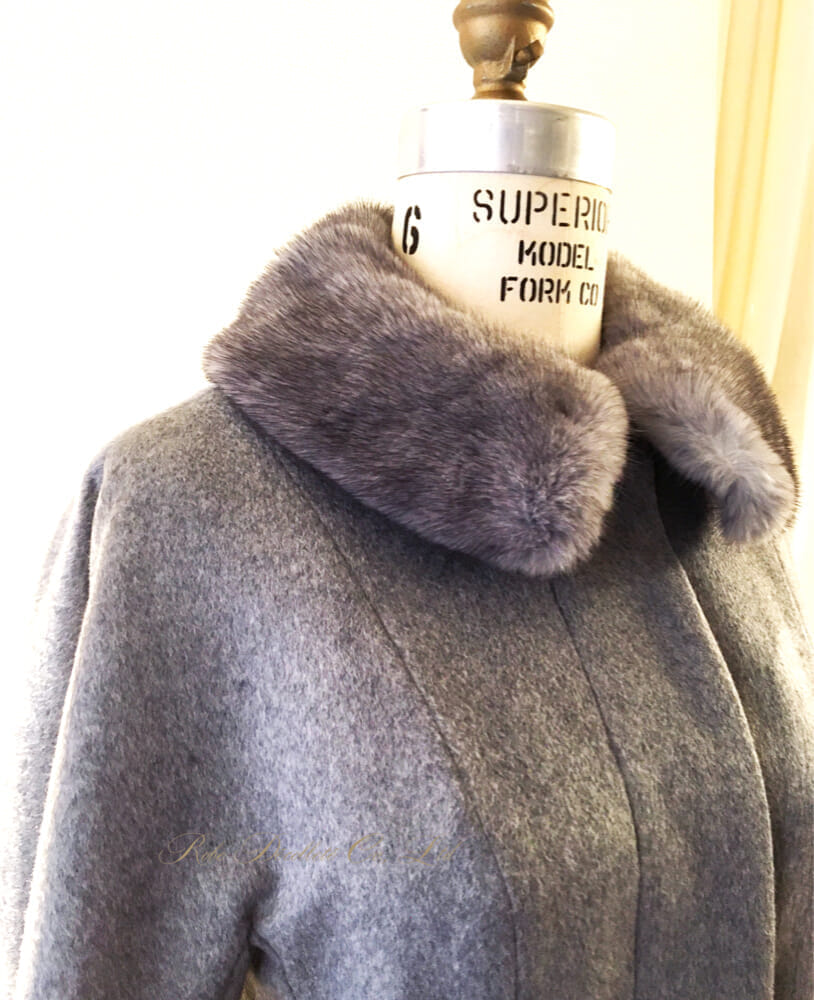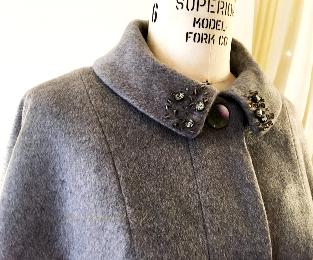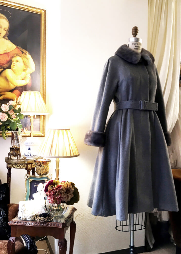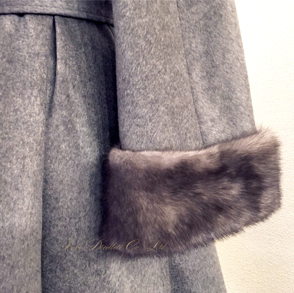 上品なグレーのカシミヤにブルーアイリスミンクを衿とカフスに贅沢に使用したデザイン。ミンク衿を外すと衿先にはスワロフスキーラインスートンのビーズ刺繍、