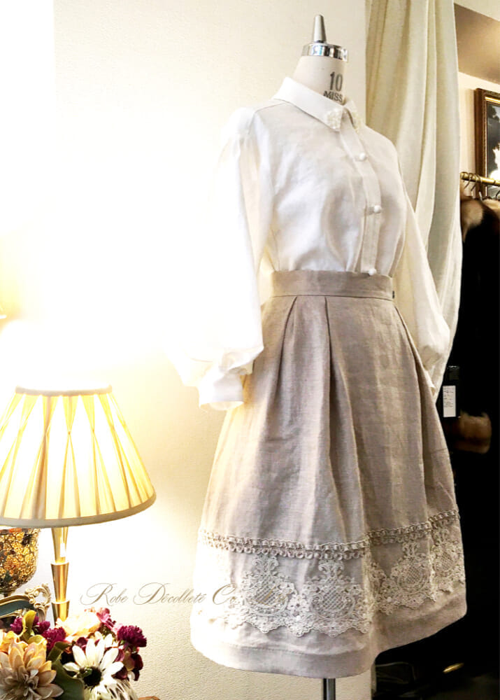 French Linen Skirt < Saint-Honore> フレンチリネンスカート < サントノーレ> フランス製クチュールレース トリム/ナチュラル シルエットが可愛らしい エレガントなスカート 天然素材の魅力的な素材感 フランス製の美しいレース ファスナー開き 両脇ポケット 裏地裾レース付き クチュール技巧 <組成> スカー部分/麻100% <サイズ> 40 <カラー> ナチュラル <寸法> ウエストX着丈 68.5cmX58cm
