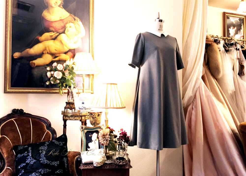 襟先には半透明の天然石と2種類のビーズ刺繍を施しクチュール感のあるシンプルなオードリースタイルドレスです。