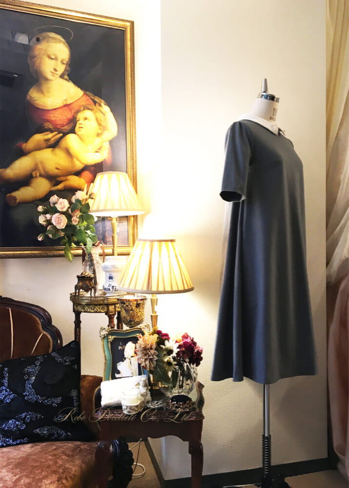 前身頃は広がりすぎず、サイドから後ろにかけてフレアーが流れるように上品さと華やかさを意識して型紙を操作しデザインしています。